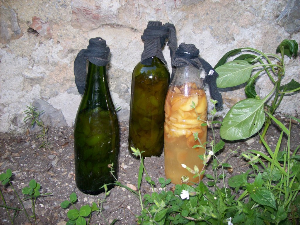 Mojca, onze buurvrouw gaf me een recept voor appelazijn en ik ging direct aan de slag met een paar gewone wijnflessen. De zure appels in stukjes snijden, het klokhuis verwijderen. De flessen worden met 1/3 appels gevuld, 2/3 water en 1 lepeltje suiker. Met een lapje stof worden de flessen afgesloten en op een zonnige plek gezet. De eerste week moet je elke dag de flessen even schudden. Derna laat je het spul gisten en brubbelen tot het naar appelazijn smaakt (sorry, buurvrouw kon geen preciezere instructies geven!). Als de azijn klaar is, worden de appels eruit gezeefd, gekruid (met basiclicum of rozemarijn) en in flessen met kurk bewaard.