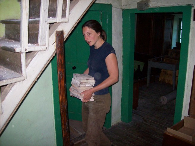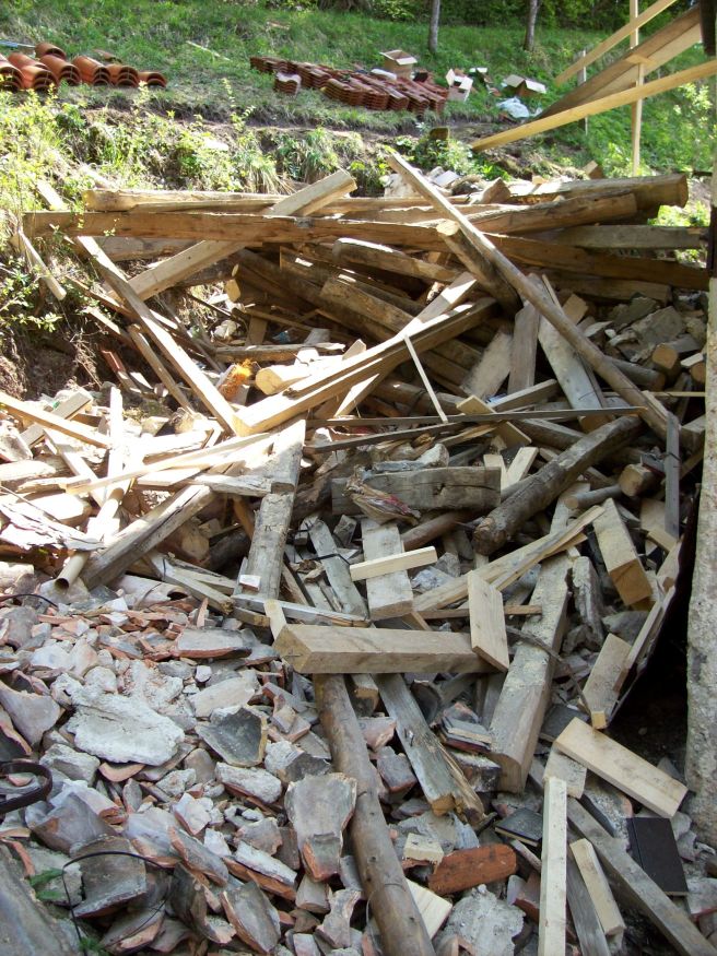 4. Afbreken die ouwe boel! En merk bij de afbraak van zo een oud dak op dat alles gerecupereerd kan worden: oude dakpannen (voor het toekomstige tuinhuisje), hout (bruikbaar en als brandhout) en steengruis (ophoging parking en uitbreiding zonneterras).