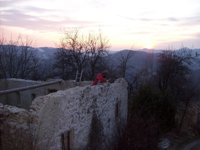 Dit witte tapijt werd door de lente in een mum van tijd weggeveegd. Einde Winter! De eerste zonnestralen verwarmden het huis en wij haalden onze betonmolen en truweel terug boven. De Museumkamer, onze eerste gastenkamer, zijn we momenteel aan het plakken. Het afbreken van het bovenste deel van de stal werpt ook hier zijn vruchten af: een mooi uitzicht op de heuvels vanuit de gastenkamer.