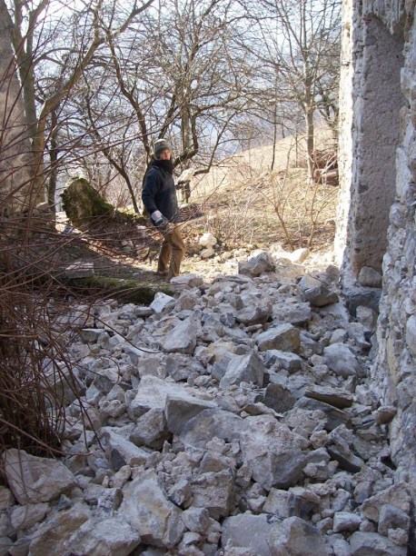 De betonmolen werd op non-aktief gezet. Om het lijf warm en de moraal hoog te houden, braken we een stukje van de stal af. Op termijn gaat de hele boel plat, zodat we ruime parkeerplaats hebben en voldoende stenen om de oude muurtjes in de tuin te herstellen.