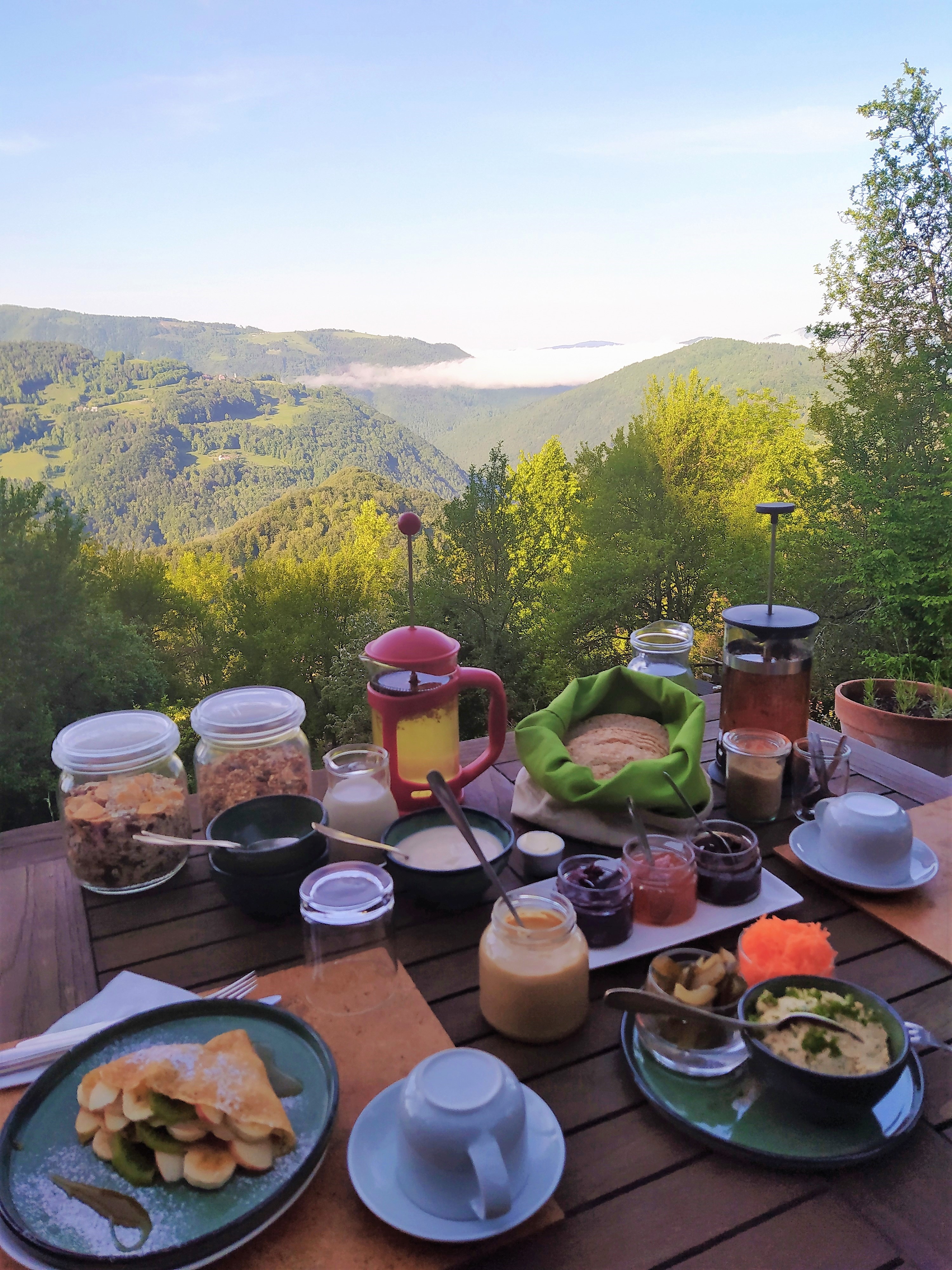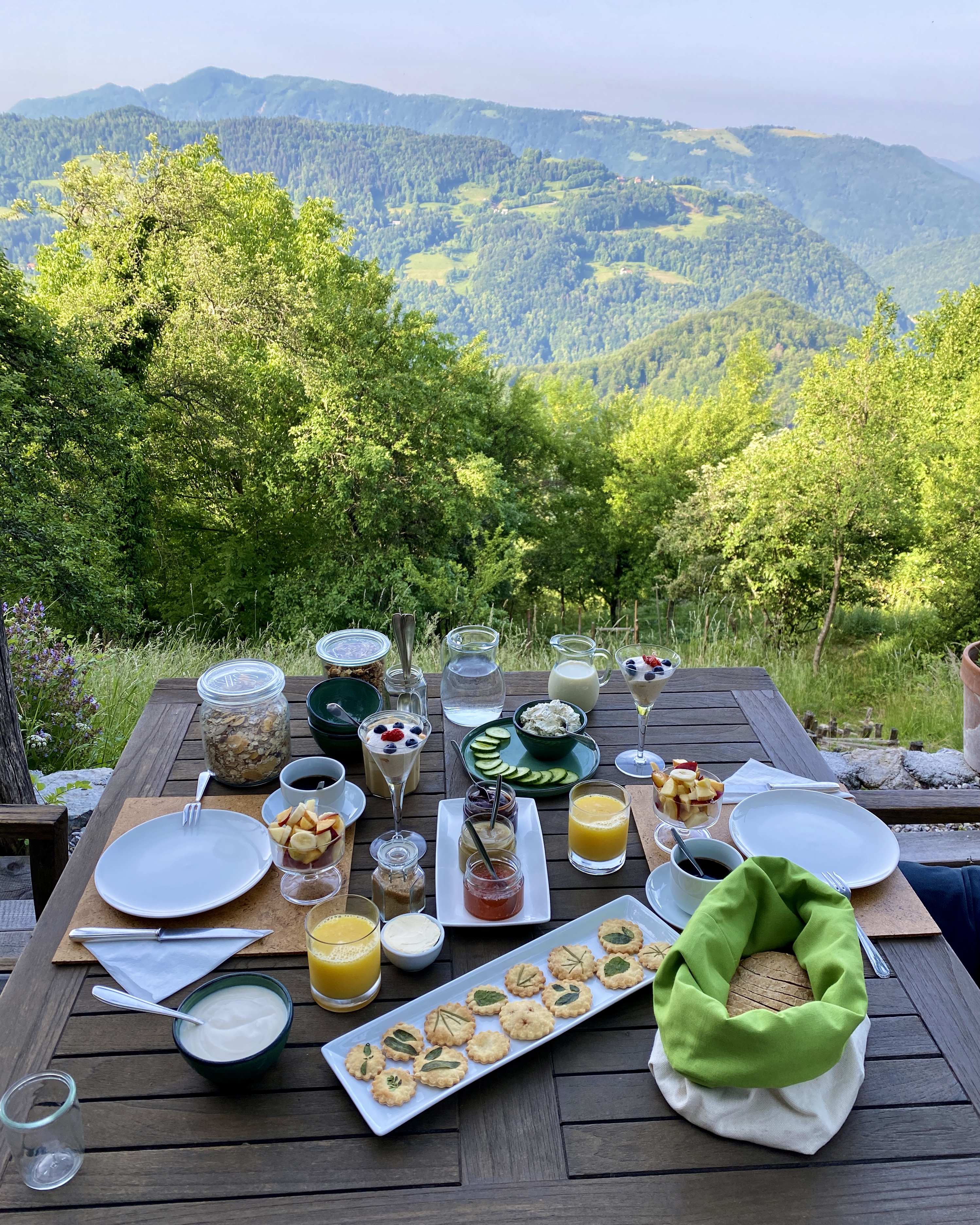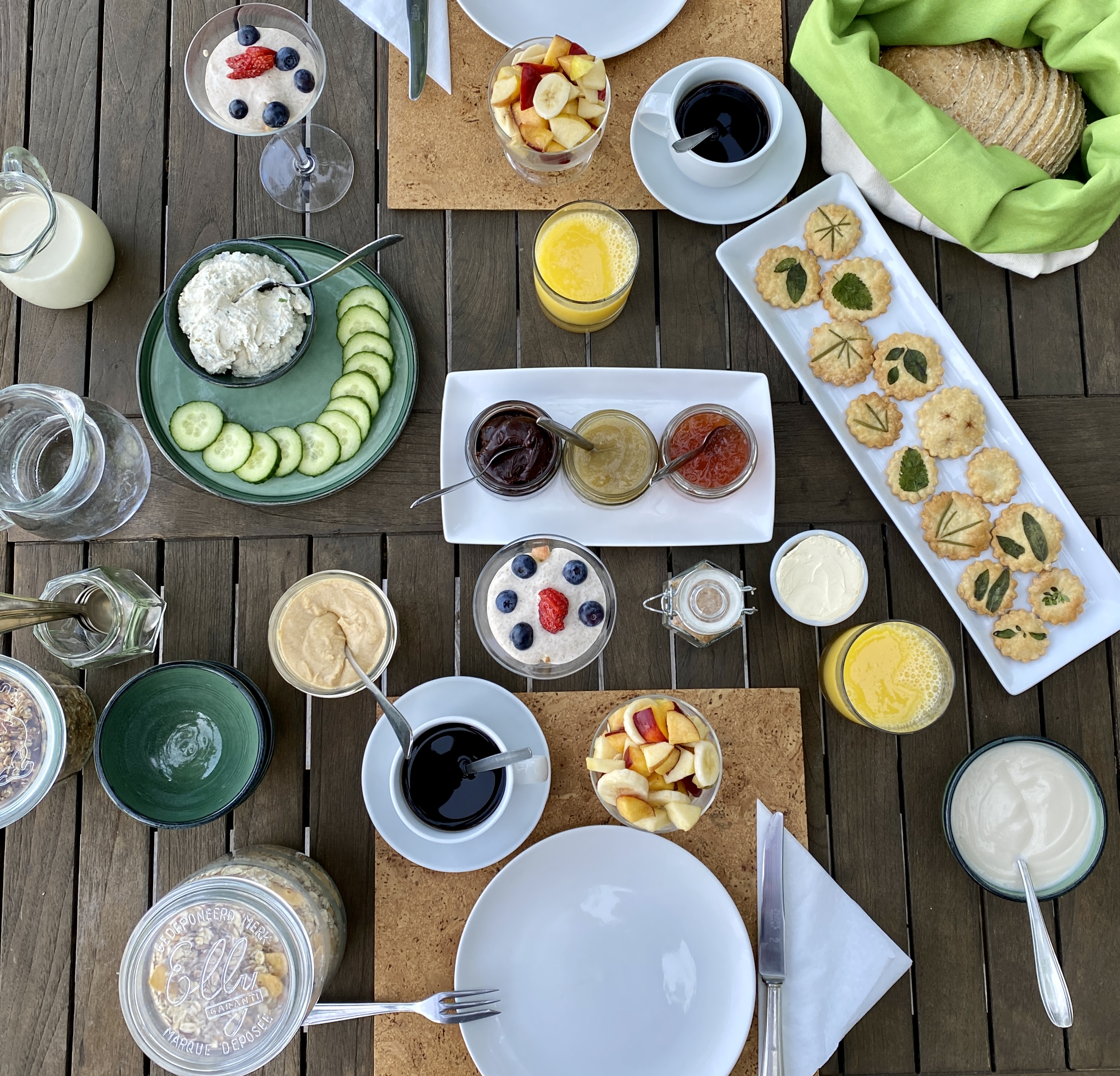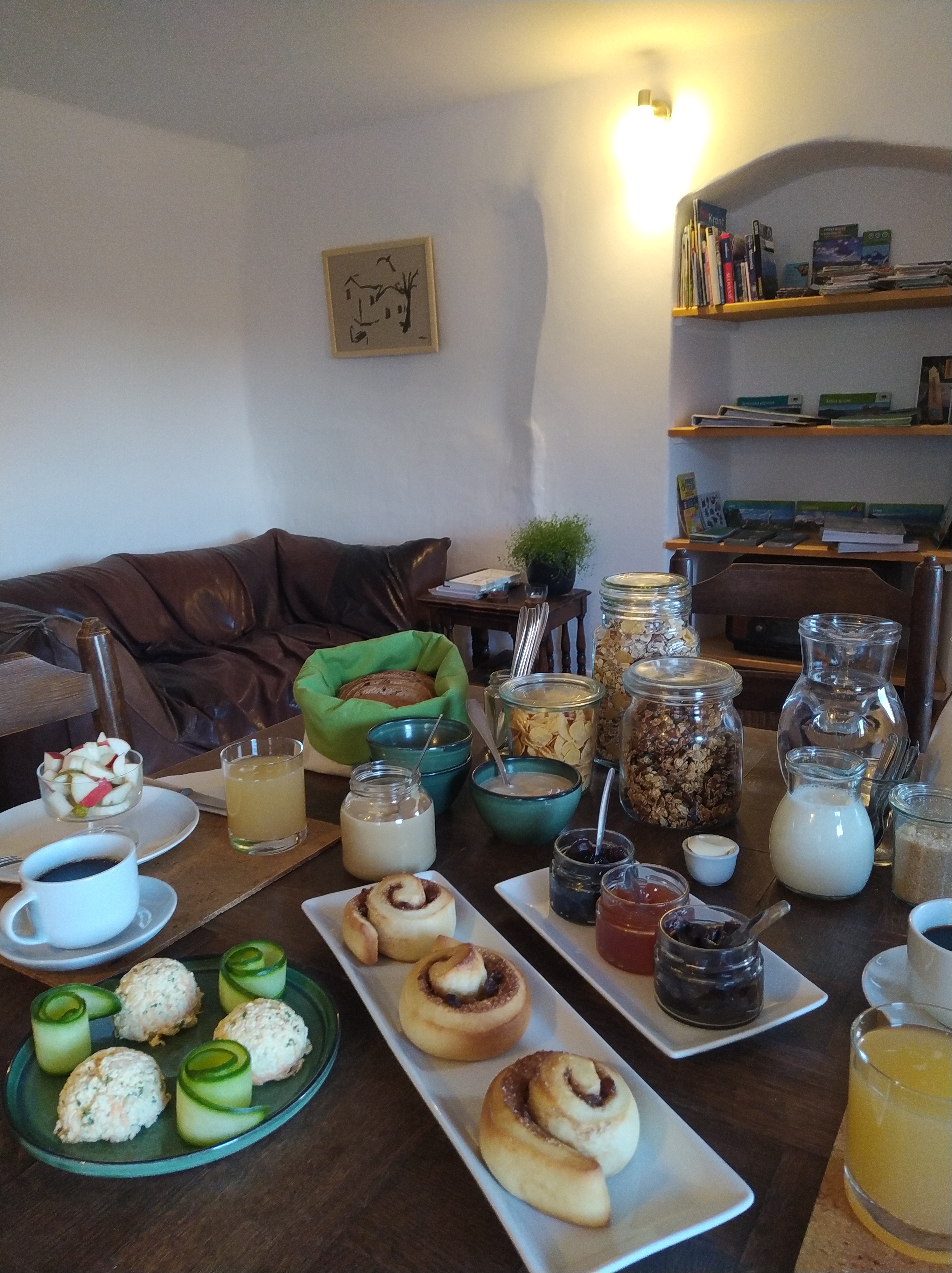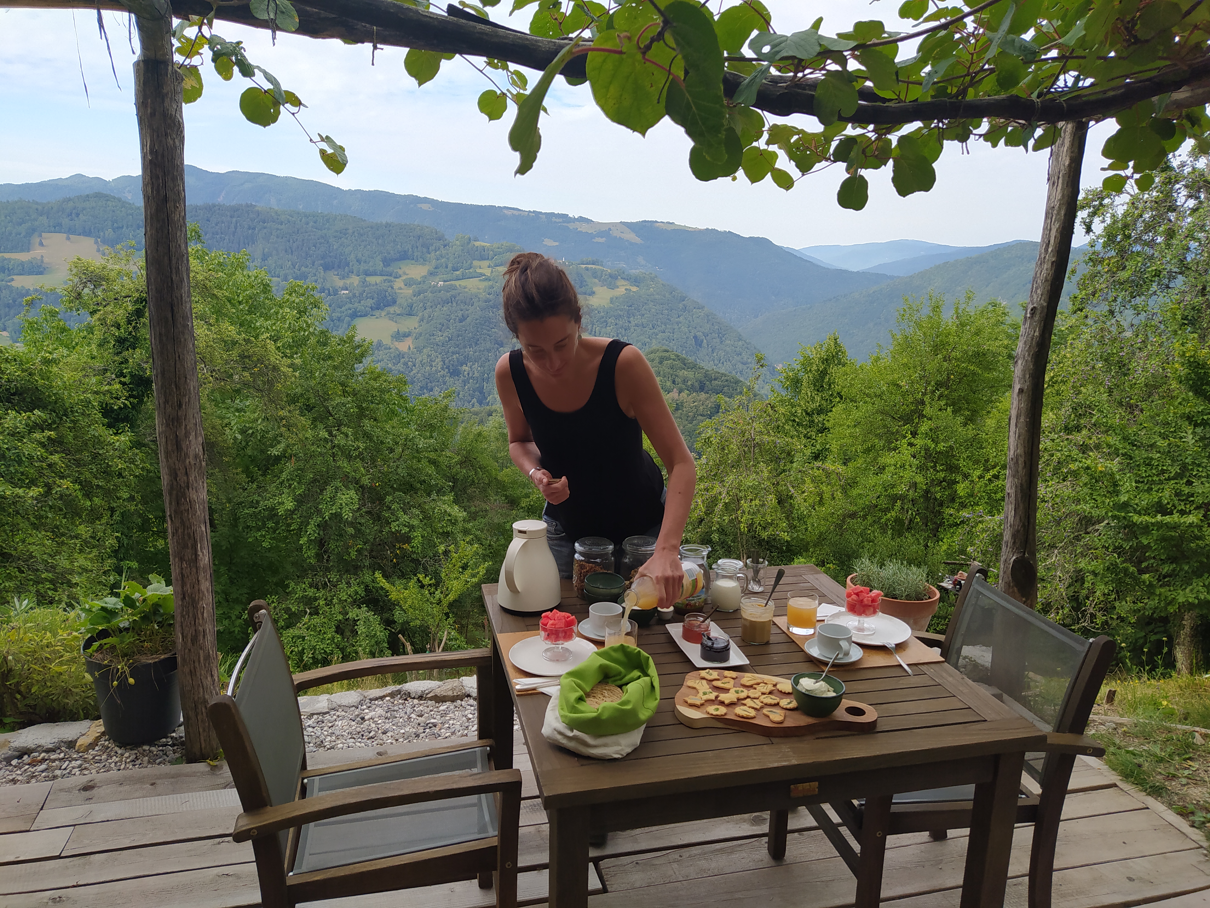 De ontbijttafel dekten we meestal buiten op de kiwipergola of aan de vijgenboom. Bij het ontbijt proefden de gasten regelmatig kruiden of bessen uit de tuin.