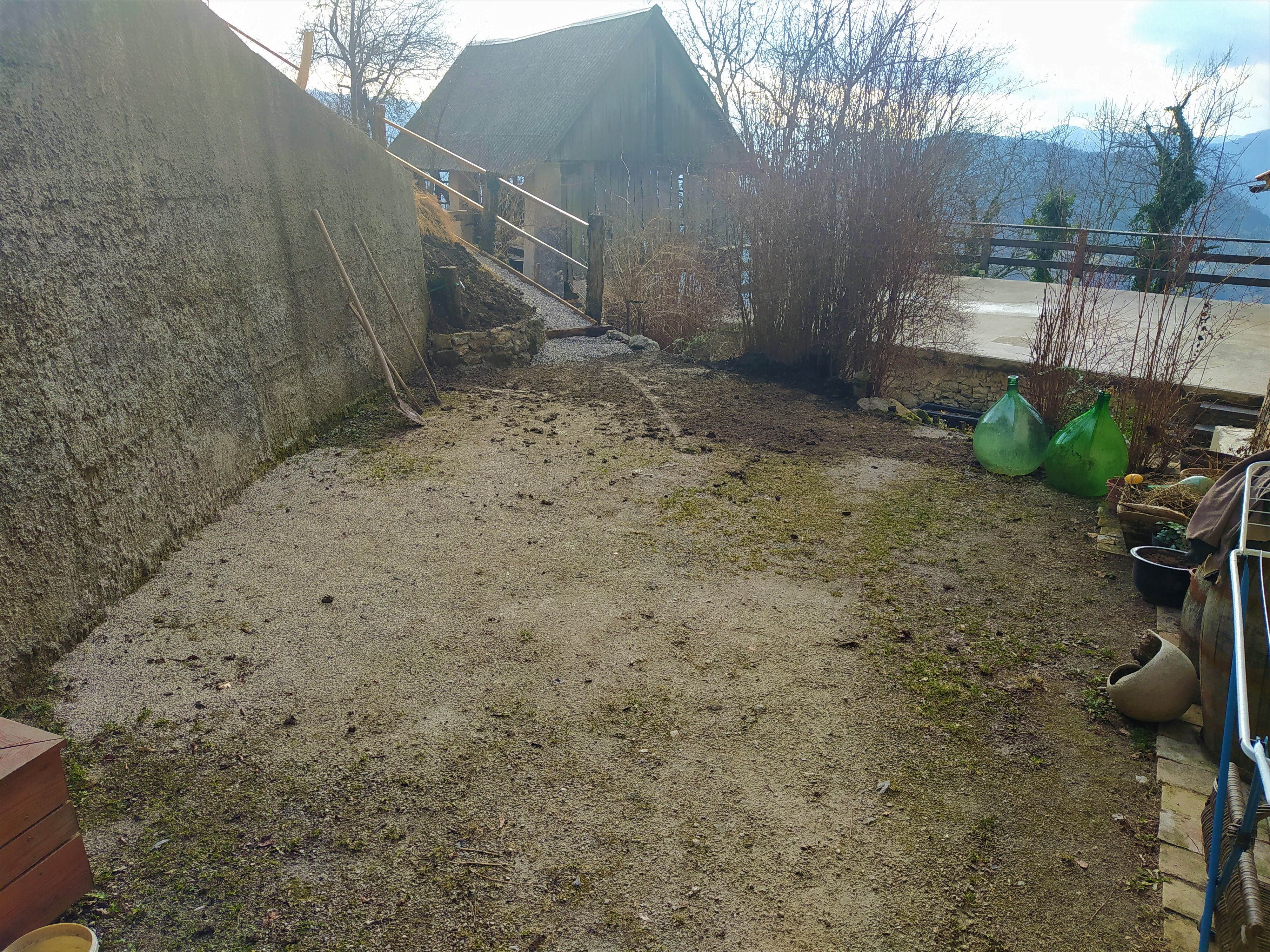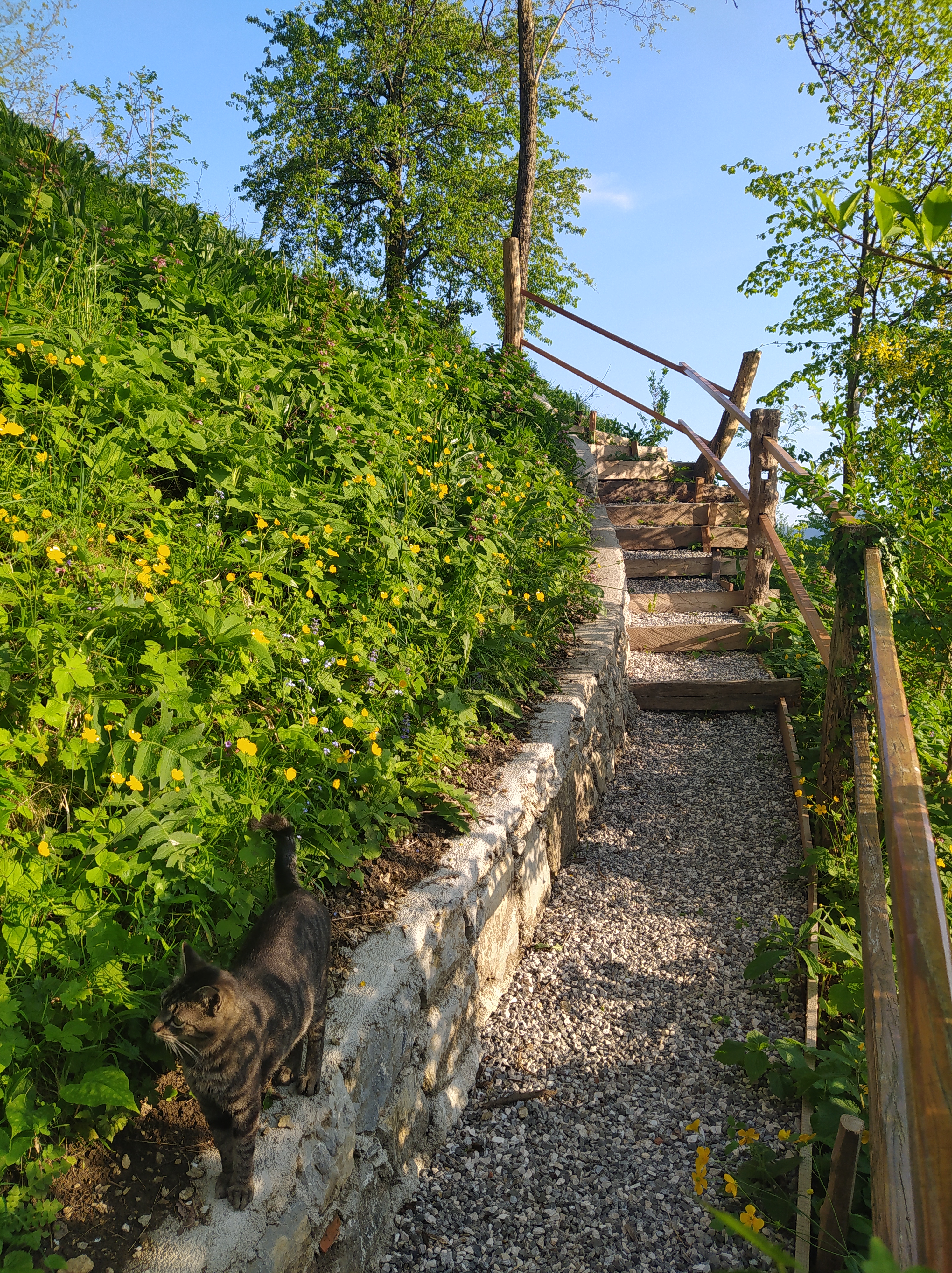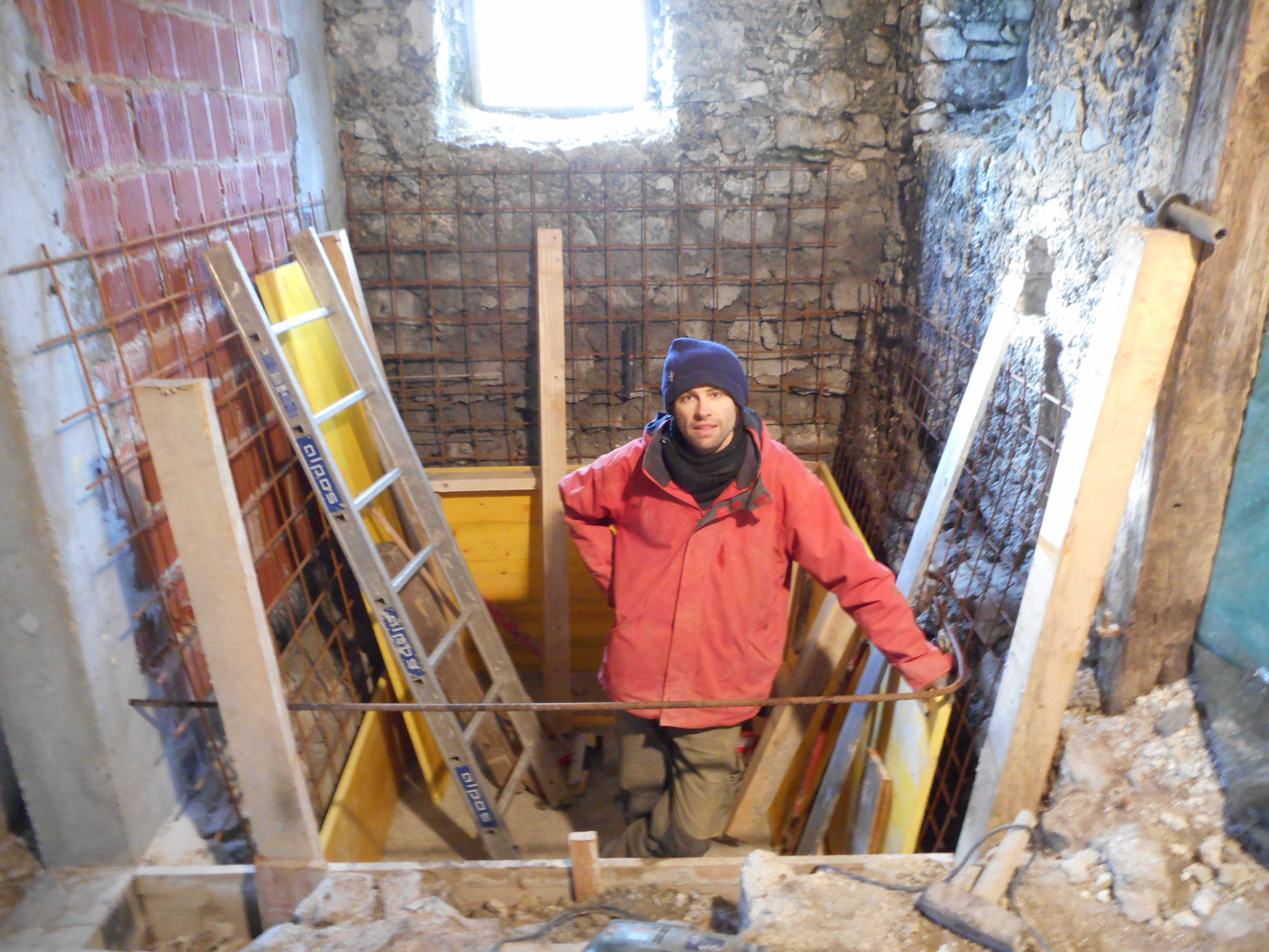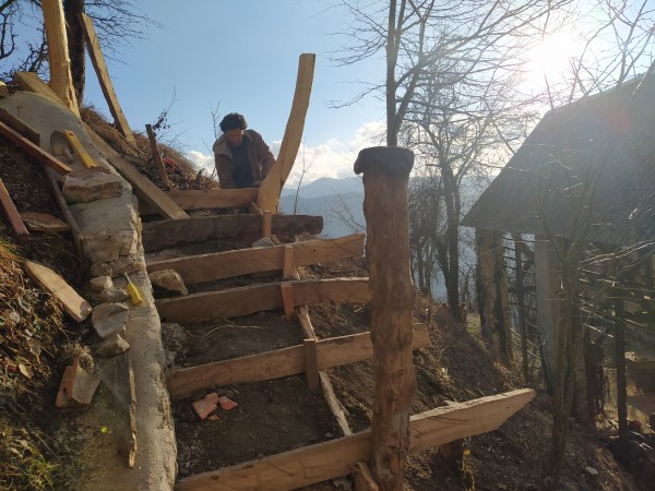 Zo goten we met hen een reepje beton in de stal, schuurden een oude deur af en kuisten een stuk bos op. De grootste klus was het verder graven, timmeren en metsen aan de nieuwe trap naar de kiwipergola.