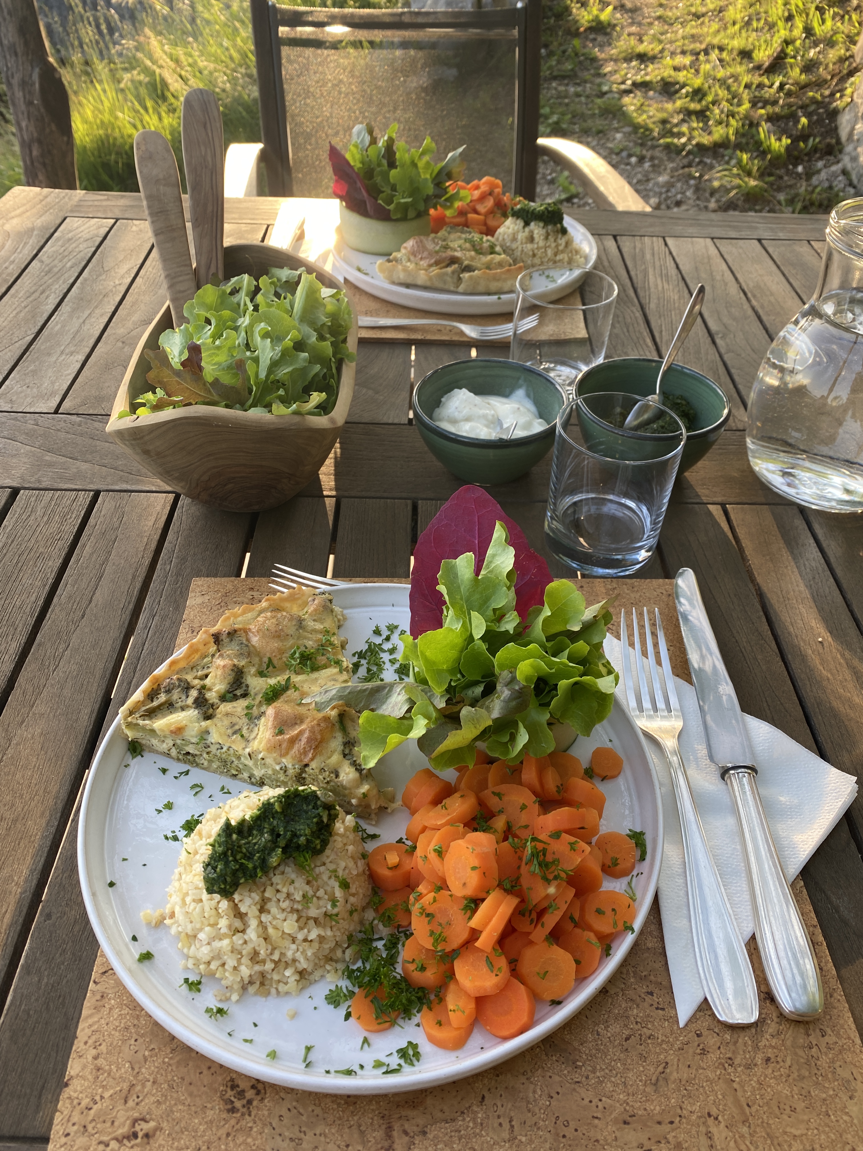 Dankzij de regenwaterput hadden we het hele seizoen door water. Hoewel we eind augustus zuiniger moesten omspringen met water voor de moestuin, konden we er toch regelmatig oogsten. Els voorzag de gastenkamers, ontbijttafel en avondmaal zoveel mogelijk van moois & lekkers uit de tuin.