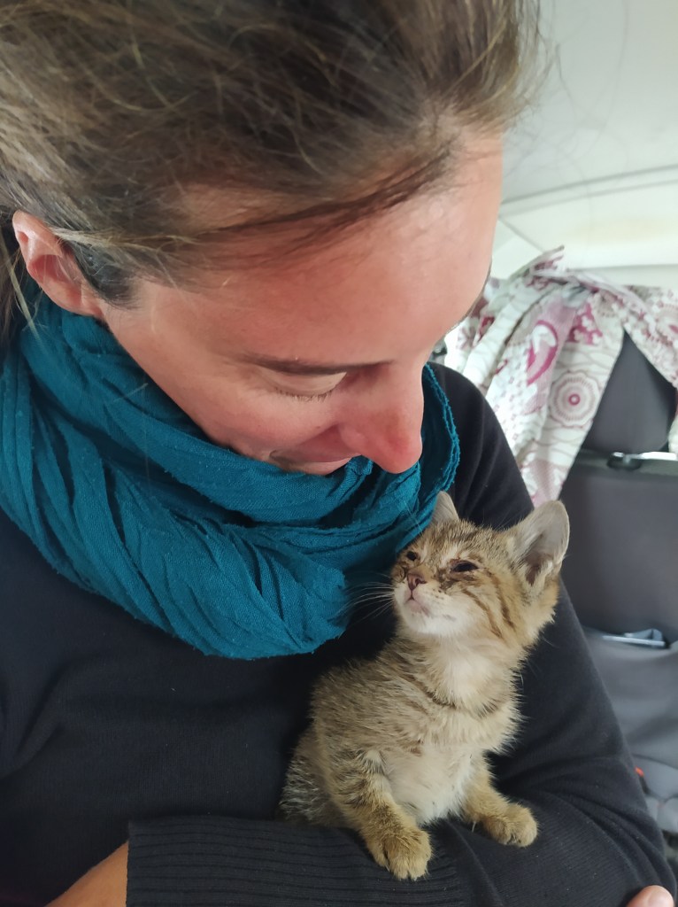 Tijdens de terugrit hoorden we in een Albanees park een katje hardverscheurend janken. Het plan: haar een nachtje bij ons laten logeren en de volgende ochtend naar het asiel brengen. De realiteit: nachtje logeren, geen asiel te vinden, katje mee naar huis. Welkom, Fari!