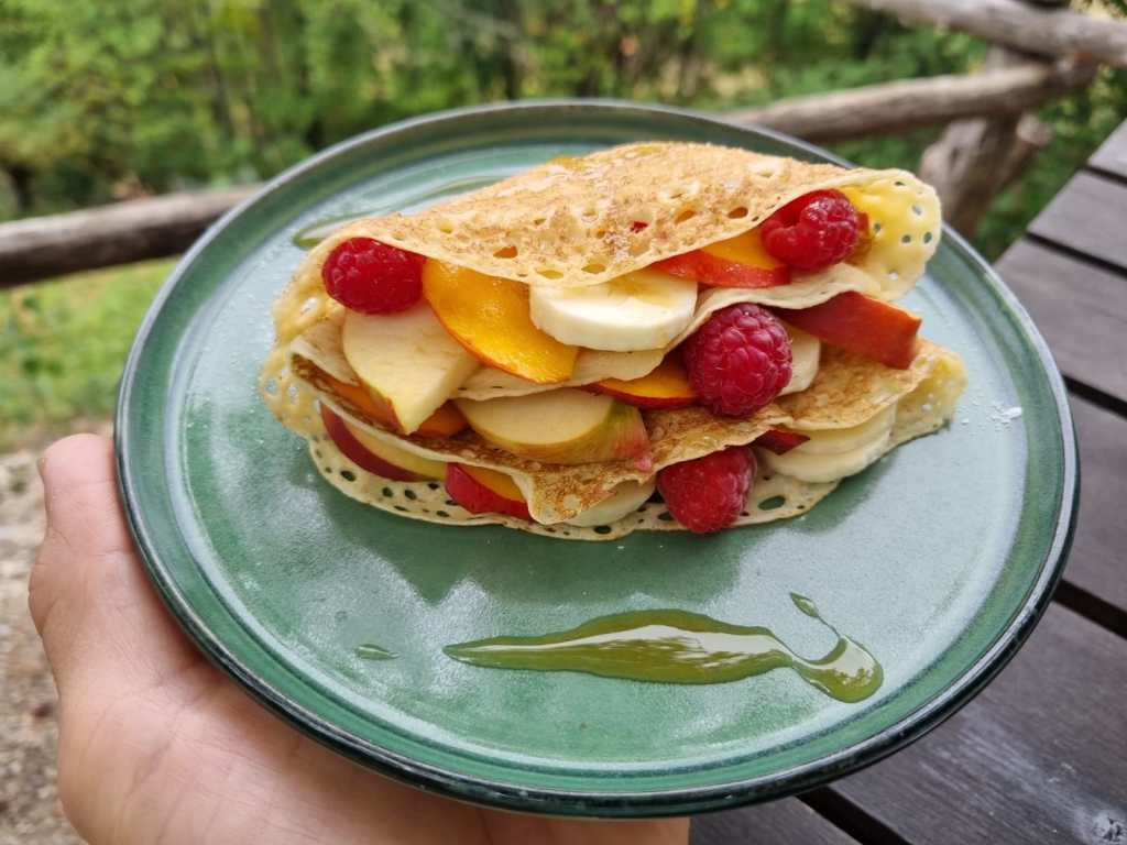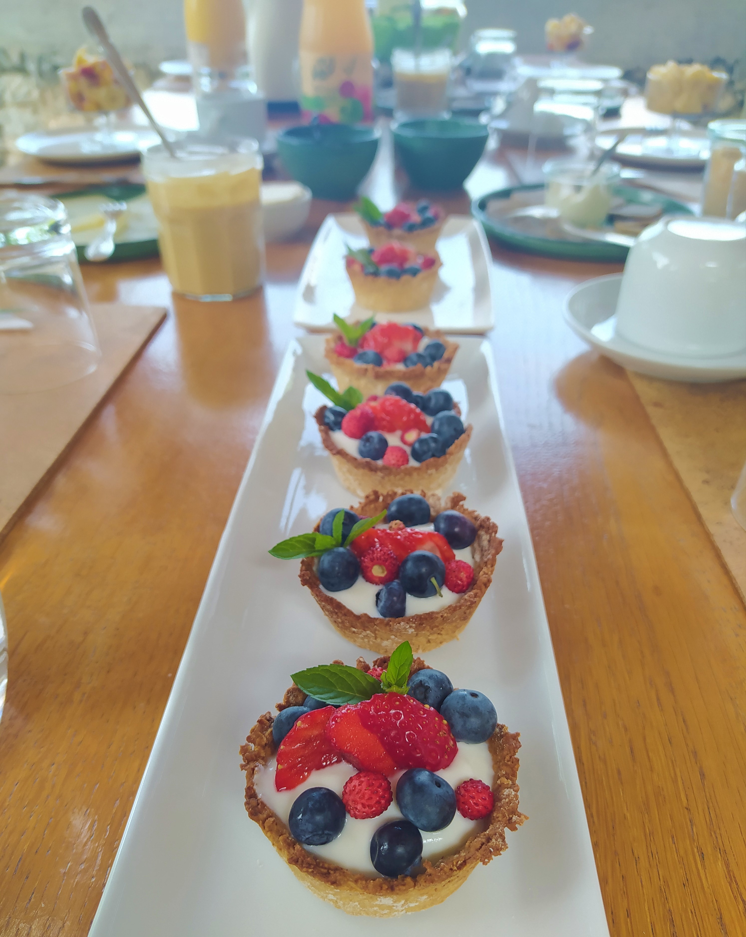 De ontbijttafel dekten we meestal buiten op de kiwipergola of aan de vijgenboom. Bij het ontbijt proefden de gasten regelmatig kruiden of bessen uit de tuin.