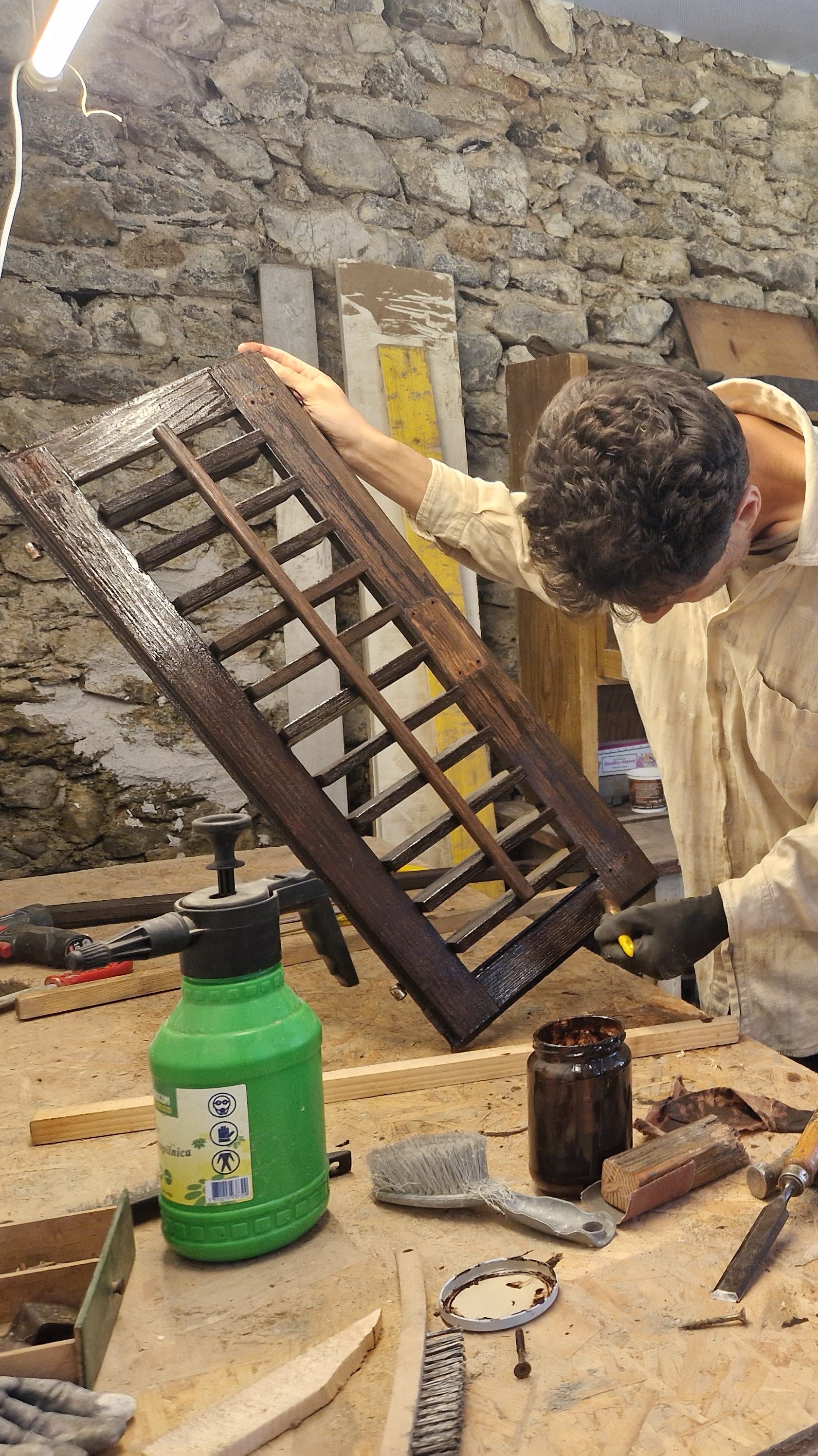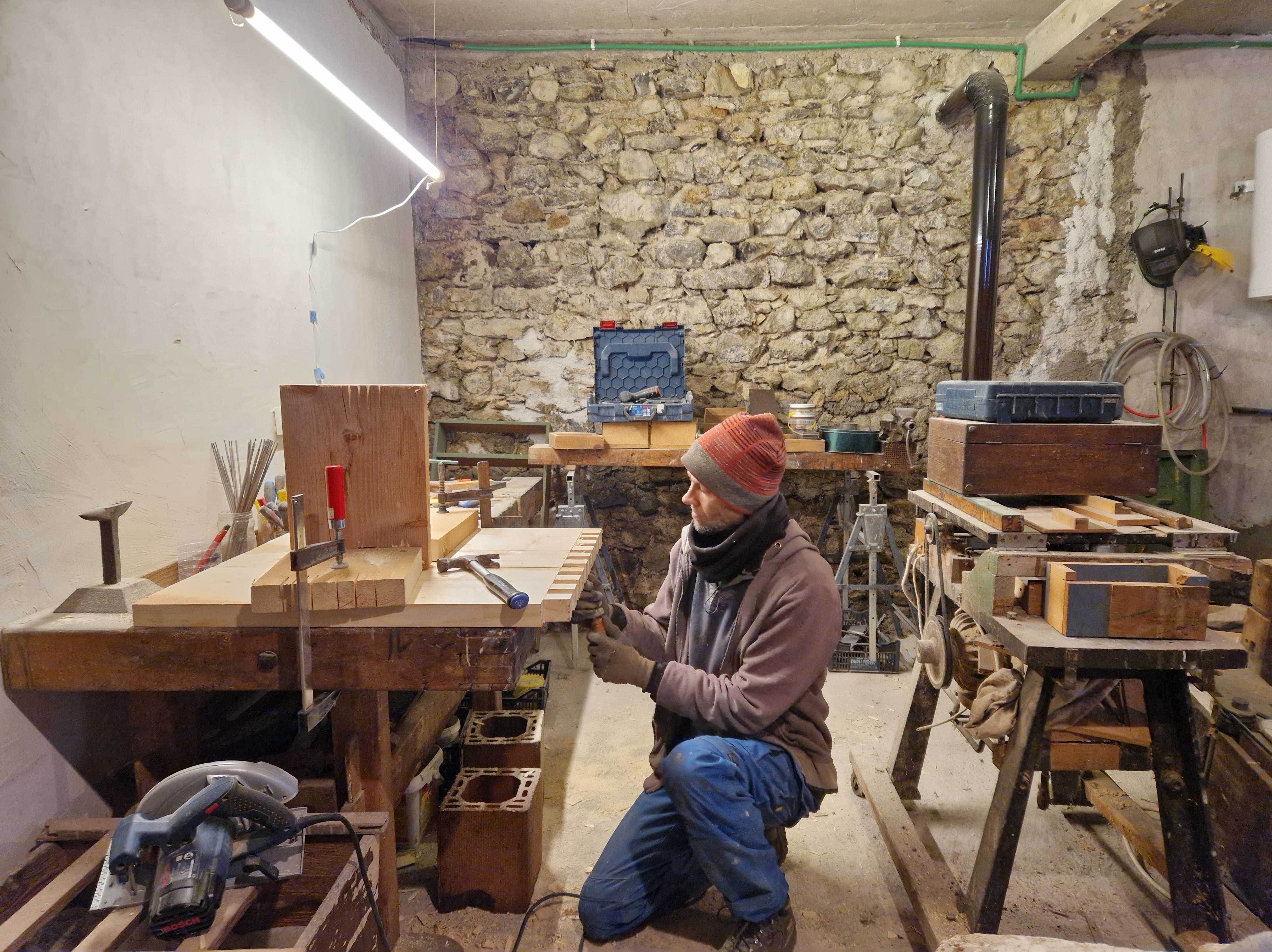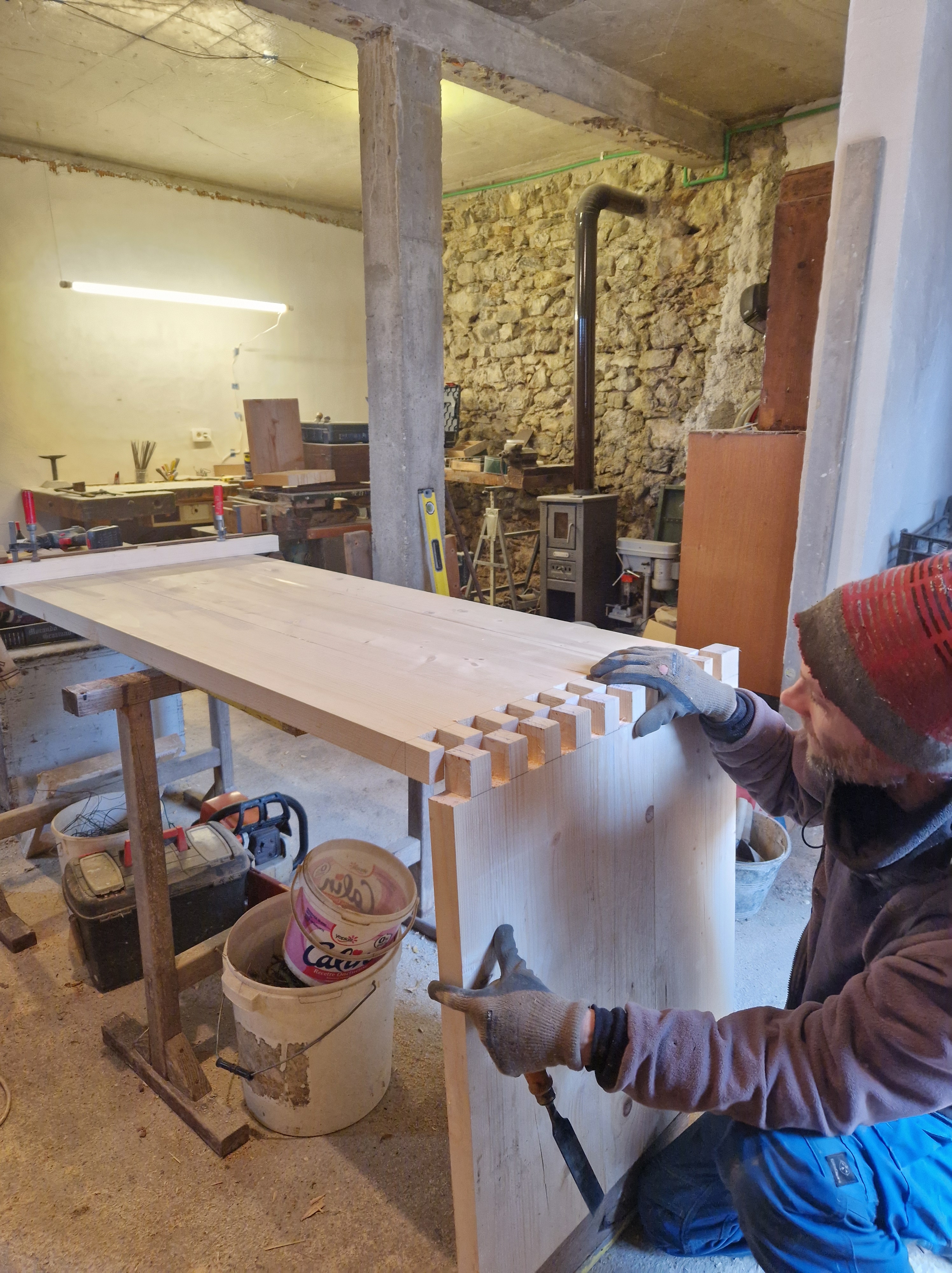 Alvorens naar Slovenië te verhuizen, volgde Mathieu een cursus houtbewerking. Deze winter haalde hij zijn vaardigheden vanonder het stof, dook zijn geïsoleerde mancave in en ging de uitdaging met het hout aan. Resultaat: gastenkamer 3 heeft een nieuwe houten tafel!