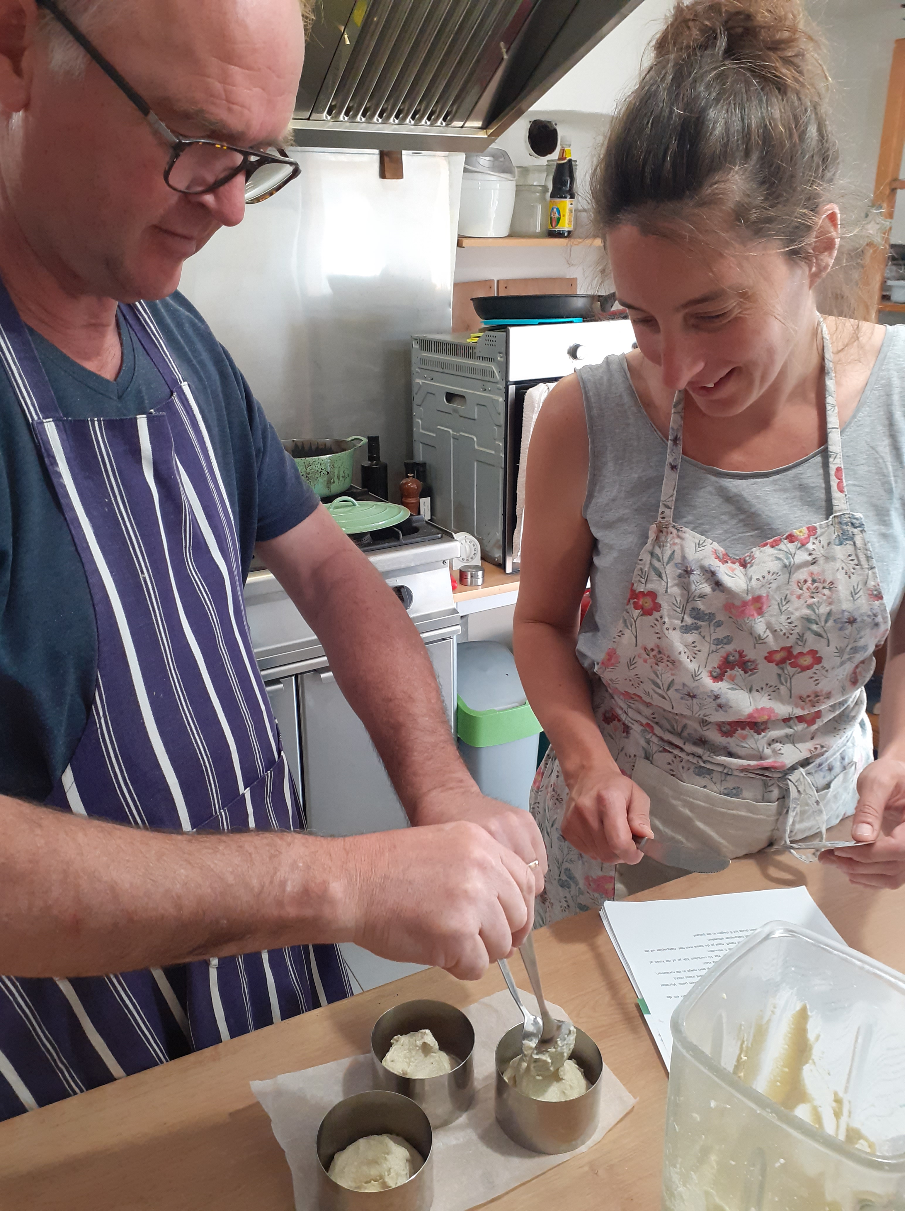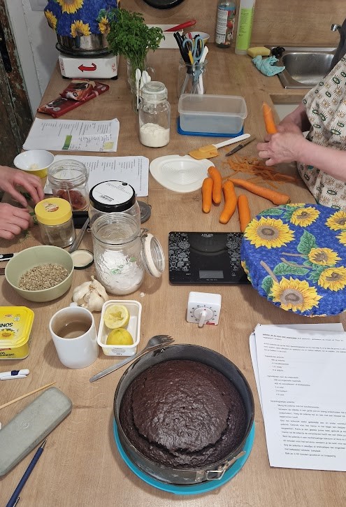 Helemaal bovenaan het lijstje van Els haar culinaire uitdagingen stond het organiseren van een kookworkshop. In de winter stelde ze zorgvuldig een receptenbundel op. De titel? “Koken met Els”: elke dag een avondmaal, dessert en ontbijt voor de volgende dag (brood, hartig beleg en een extra’tje) bereiden. In de voormiddag was er tijd voor een uitstap. In de namiddag werd er samen gekookt, met tussendoor een koffiepauze (en iets lekkers) op het terras. De drie deelnemers waren snel gevonden, in mei gaf Els haar eerste kookworkshop! Met succes, zowel voor Els als de deelnemers. Hier enkele sfeerbeelden van de kookworkshop: