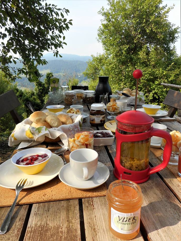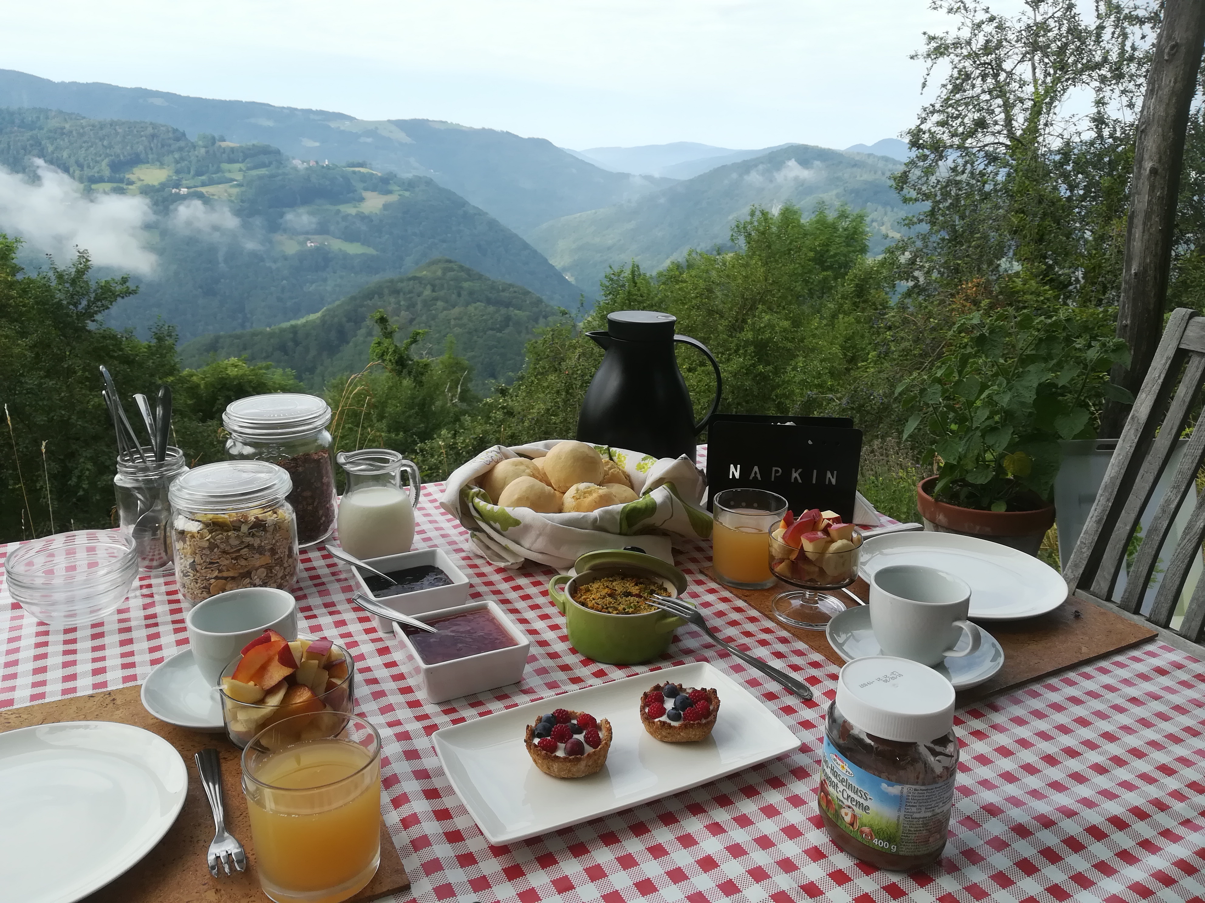 Bij het avondmaal zetten we eigen bronwater op tafel. We bieden ook Sloveense wijn, bier, limonade, huisgemaakte porto en bio-appelsap aan (niet inbegrepen in de kamerprijs).